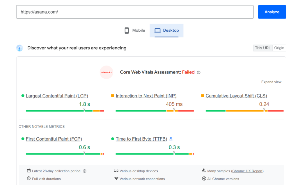 Despite all of this, Asana has a meaningful technical weakness: Core Web Vitals. We found an LCP of 1.9 seconds (needs improvement), a CLS score of 0.24 (poor, against a threshold of ≤0.1), and an INP of 412 milliseconds (very poor, against a threshold of ≤200ms).