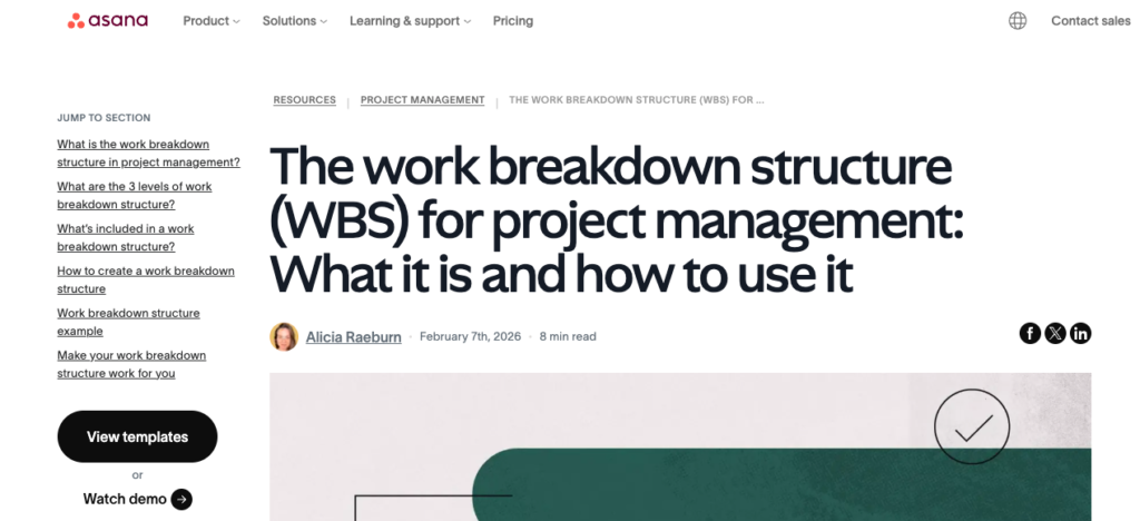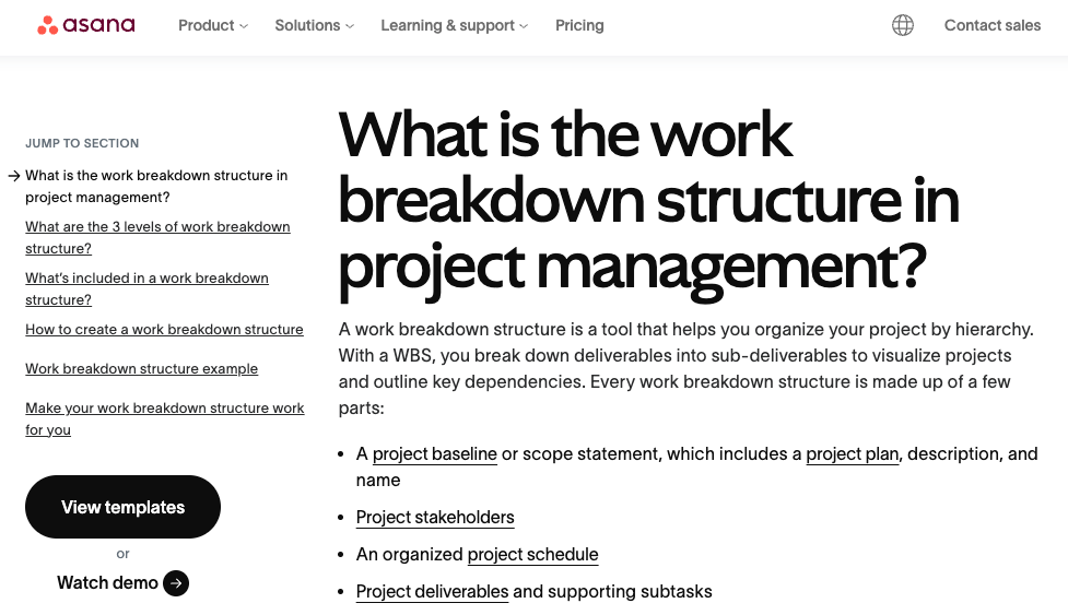 Immediately below each question heading sits a 40 to 60 word definition. That length is deliberate, it’s the range Google prefers when extracting paragraph featured snippets. Asana’s WBS page opens its definition section by describing a work breakdown structure as a visual way to organize project deliverables based on dependencies, with the project objective at the top and sub-dependencies below. Concise, structured, and cleanly extractable without surrounding context.