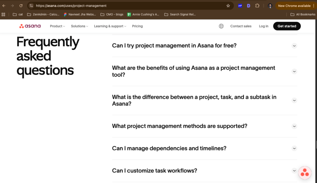 Asana adds FAQ sections to key pages as a fourth extraction point. Their project management page includes a dedicated FAQ block with questions like “How to become a project management professional?” and “How to choose project management software?”