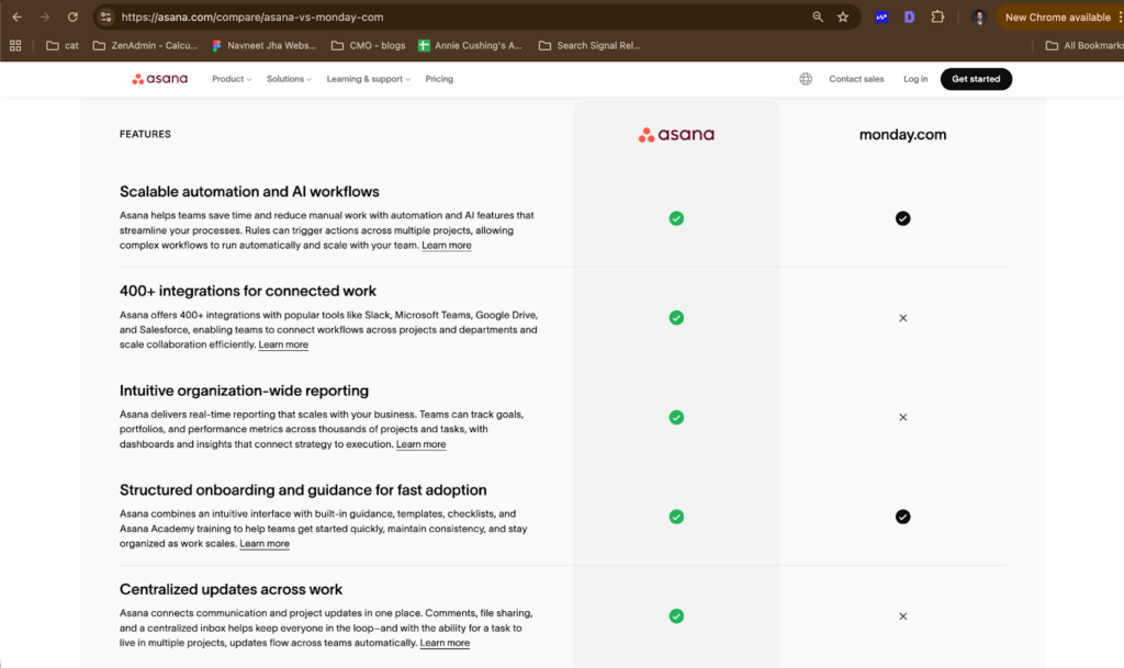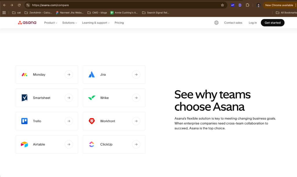 When a buyer is ready to choose, Asana has 12+ dedicated comparison pages under /compare/ targeting searches like “Asana vs Monday.com,” “Asana vs Trello,” “Asana vs Jira,” and “Asana vs ClickUp.” Most rank on page one.