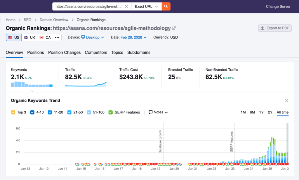 Asana’s Spanish content drives over 2 million monthly organic sessions. Mexico alone generates 676,000 visits per month. Most B2B SaaS competitors haven’t invested seriously in non-English content, which means the competitive bar in those markets is significantly lower. For companies already seeing international traffic in their analytics, multilingual SEO is one of the highest-return, lowest-competition bets available.