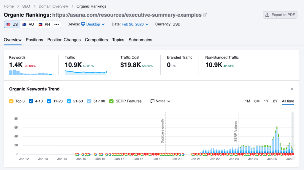 “SWOT analysis,” “Eisenhower Matrix,” and “Pareto Principle” all hold the top position for their respective terms. Their “executive summary examples” page ranks for 1,400 keyword variations and sits at #1 for a term with 28,000 monthly searches.