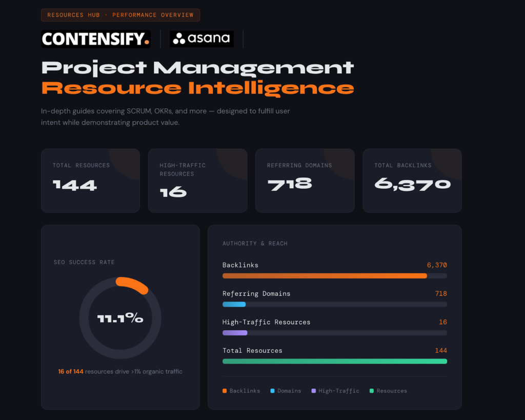 The /resources/ section is Asana’s highest-performing content asset, and the numbers make that clear. It houses 144+ long-form guides averaging 2,000+ words each, with an SEO success rate of 11.1%. That means 16 out of 144 pages each drive more than 1% of Asana’s total organic traffic on their own. The section has attracted 718 referring domains and more than 6,370 backlinks.
