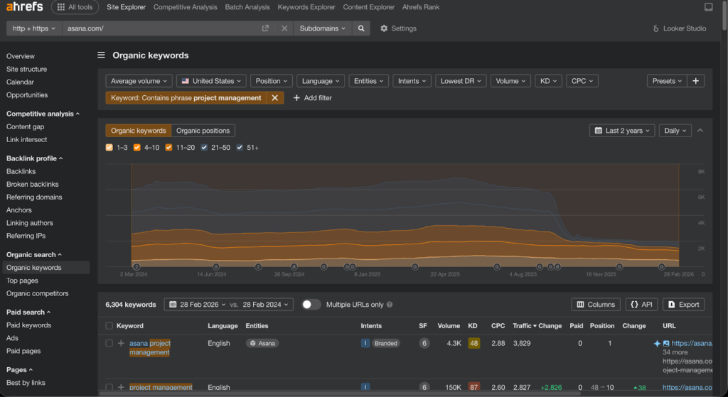 Once a buyer knows what they need, Asana is there too. They rank for 6,300 keywords related to “project management,” 452 variations of “project management software,” and 418 keywords tied to “task management.”