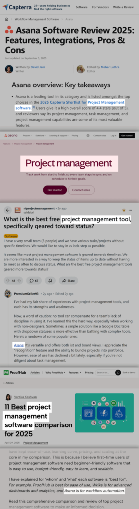Across Asana’s website, Capterra, Reddit, and third-party review sites, the same core description of the product repeats consistently. That repetition isn’t accidental, it’s consensus. When AI models encounter the same brand story told the same way across dozens of independent sources, they surface that brand with confidence.