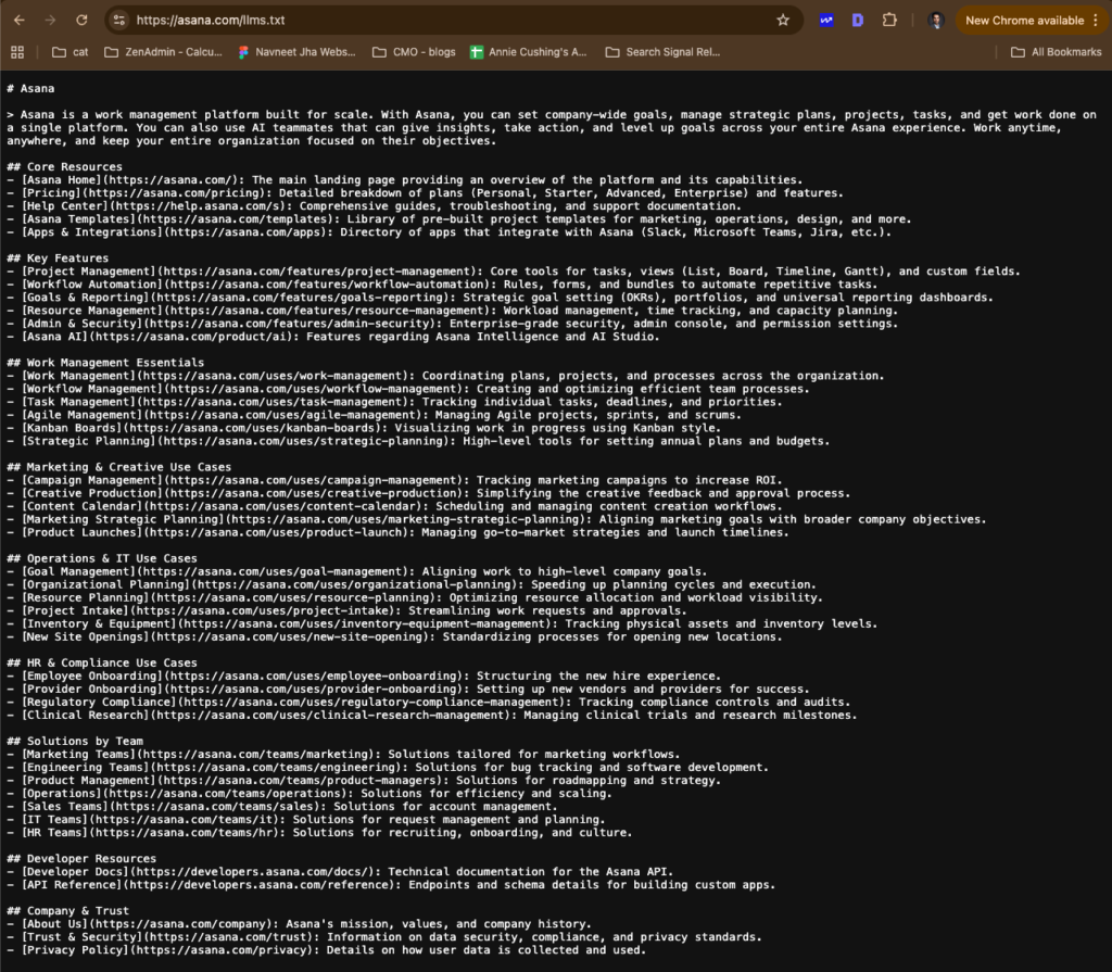 Asana has added an llms.txt file to their site, a structured file specifically formatted for LLM consumption. It’s a small but telling signal that they’re paying attention to how AI systems crawl and interpret their content.