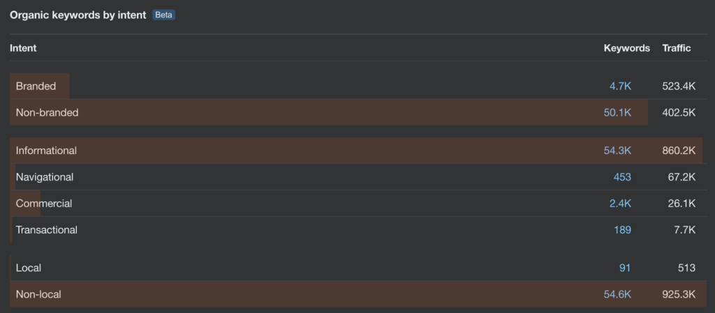 The result is full-funnel coverage with no gaps. We dug deeper into the reports and found that informational queries drive 860,200 visits per month, branded queries bring 532,400, navigational queries deliver 67,200, and commercial queries contribute 26,100.
