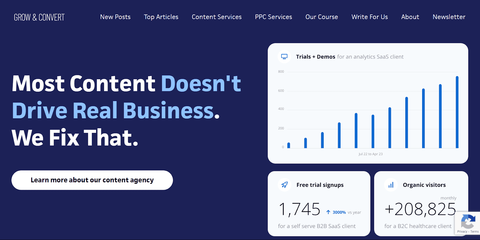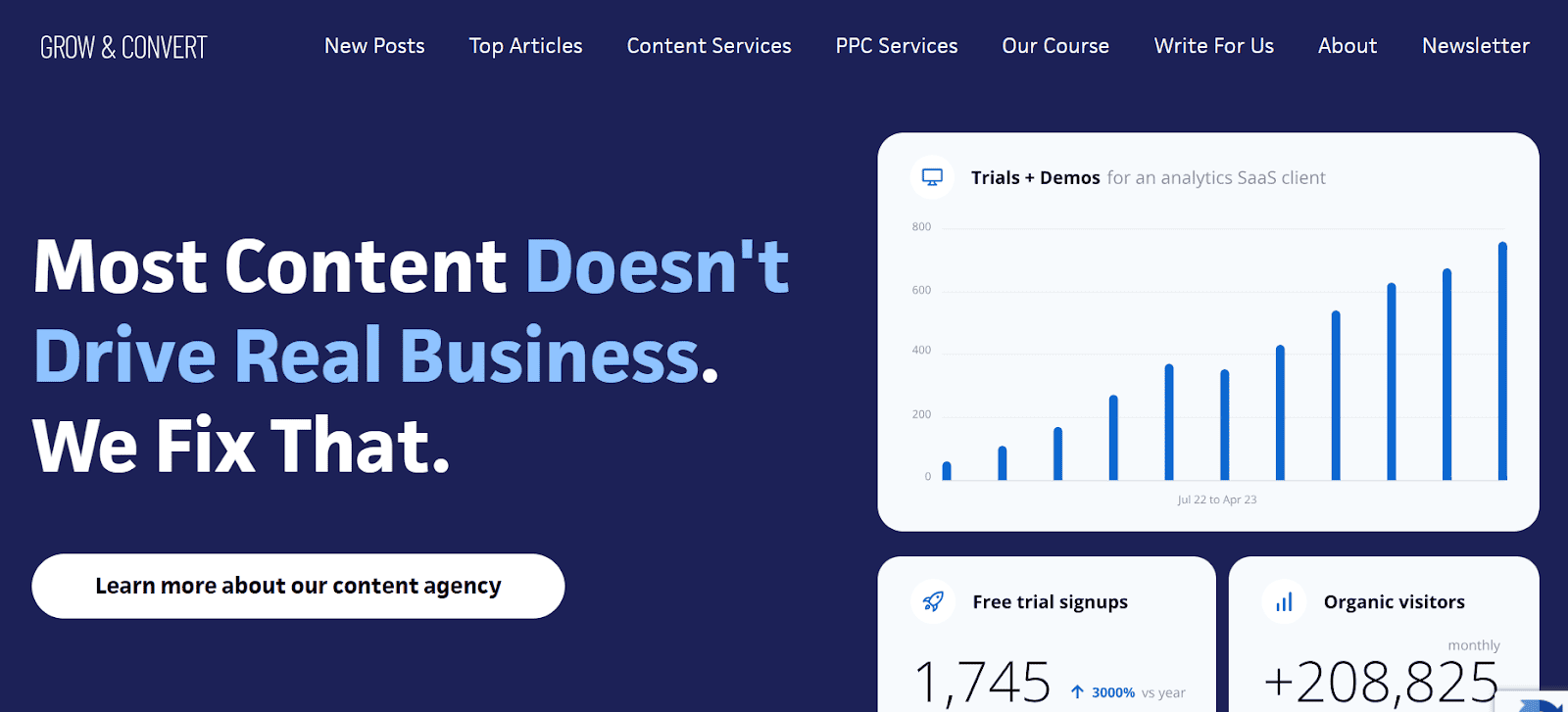 Grow and Convert is one of the best B2B content marketing agencies for B2B and B2C brands. They handle keyword research, develop and optimize the content, publish it, build links, and track analytics. Their approach is to drive leads and sales and not solely traffic. Their main focus is to understand the client’s product by interviewing team experts and ensuring the content covers features, benefits, and what makes it stand out.