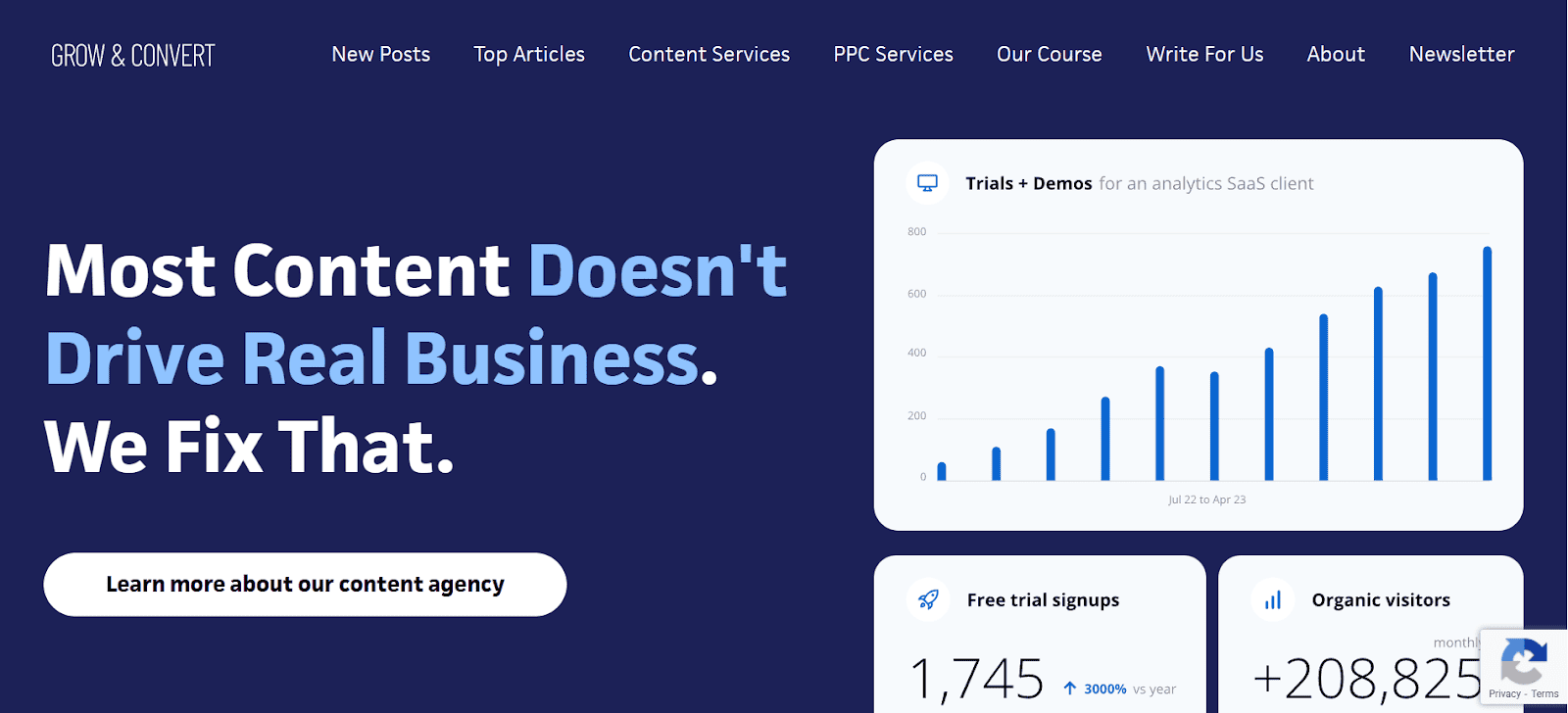 Grow and Convert builds content distribution into a larger framework focused on lead generation and SEO. Their model centers on creating content that drives conversions, not just traffic. They use targeted paid ads and strategic link building to get content in front of the right audience at the right time.