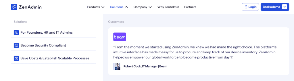 The Solutions section is also smartly divided, for Founders, HR & IT Admins, Security Compliance, and Cost Optimization, each page targeting a specific intent and keyword set.