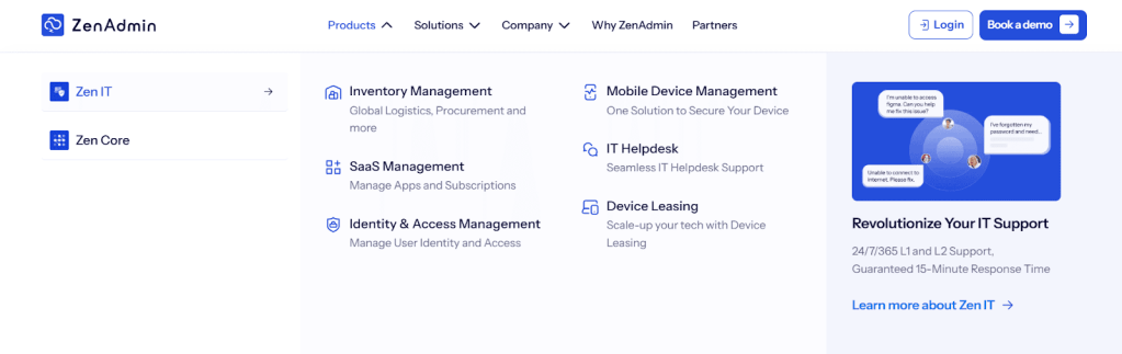 Their website is well-structured, with a clear product split between ZEN IT and ZEN Core. Each page has real screenshots, strong feature explanations, and subtle CTAs that nudge users toward sign-ups or demos.