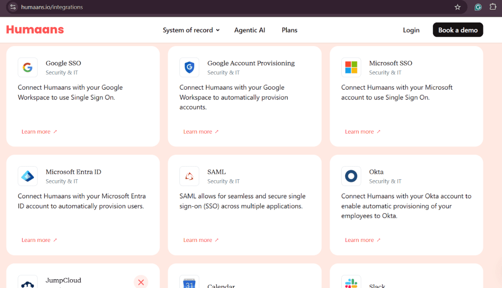 Humaans’ Integrations serve both technical and SEO goals. They target long-tail queries like “Humaans Slack integration” or “HR platform API,” while supporting topical authority and internal linking.