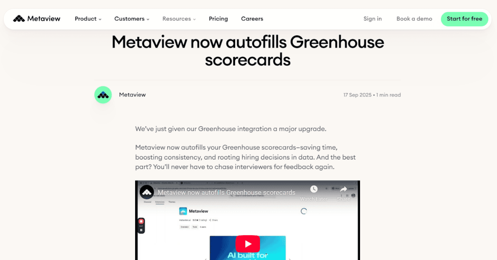 The Integrations page is a strong SEO asset. It lists tools like Greenhouse, Lever, and Zoom, optimized for long-tail searches such as “Metaview Greenhouse integration” or “Zoom interview transcription.”