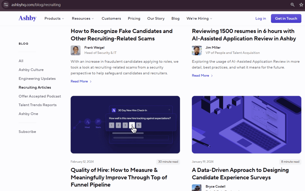 Ashby’s webinars and videos extend content life. Recorded demos and educational sessions are repurposed into shorter clips and embedded within related blog posts, building a strong content loop that reinforces expertise.