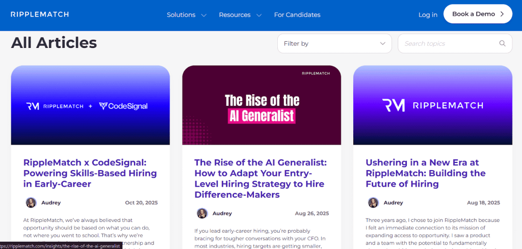 Their blog covers hiring trends, offer acceptance/reneging, and early-talent best practices, pieces built for informational and evaluative intent that surface well in snippets and internal link naturally to employer solutions.