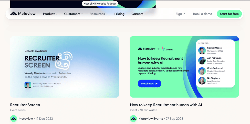 Metaview’s content is rounded out with resources like interview insights and question banks, plus live events that showcase the platform’s impact.