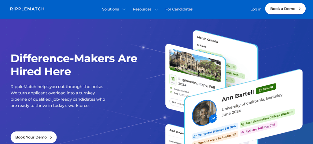 RippleMatch is an early-career hiring platform that serves both candidates and employers, offering a clear split in journeys, separate pages, tailored messaging, and keywords for each audience.
