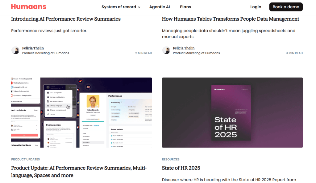 Humaans is an all-in-one HR platform built for modern, fast-scaling teams. Their content and site structure reflect a clear focus on depth, transparency, and thought leadership—positioning them as both a product and knowledge hub in HR tech.