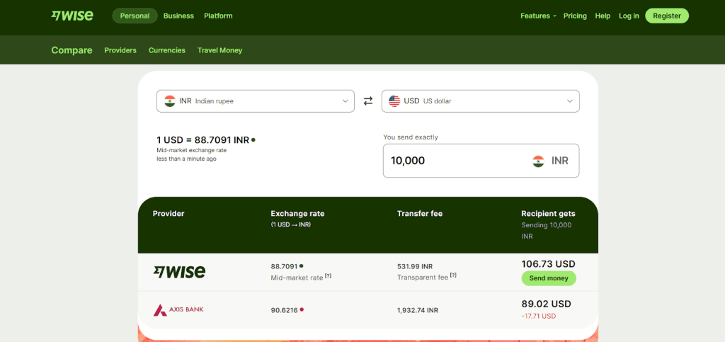 Their price comparison pages, currency guides, and fee transparency explainers make complex international payments feel simple and fair. Instead of shouting “low fees,” Wise shows you, with side-by-side breakdowns against banks and competitors.