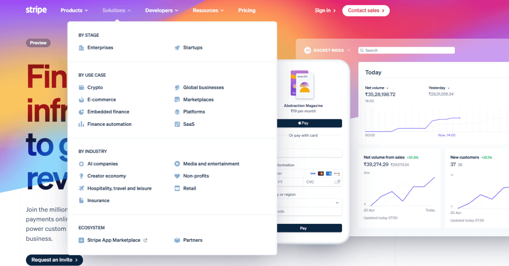 They also structure solutions by stage (startups vs enterprises), use case (SaaS, crypto, marketplaces), and industry. This means users always land somewhere relevant, and Stripe shows up for more searches with intent.