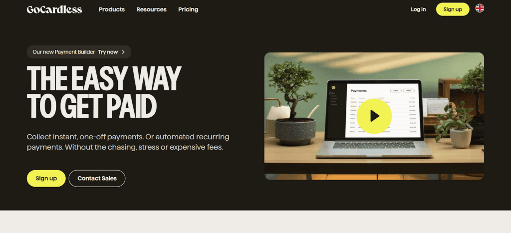 GoCardless helps businesses collect recurring payments directly from customers’ bank accounts. Their website navigation remains clean, with only three options: Products, Resources, and Pricing, making it easy to find the information you need.
