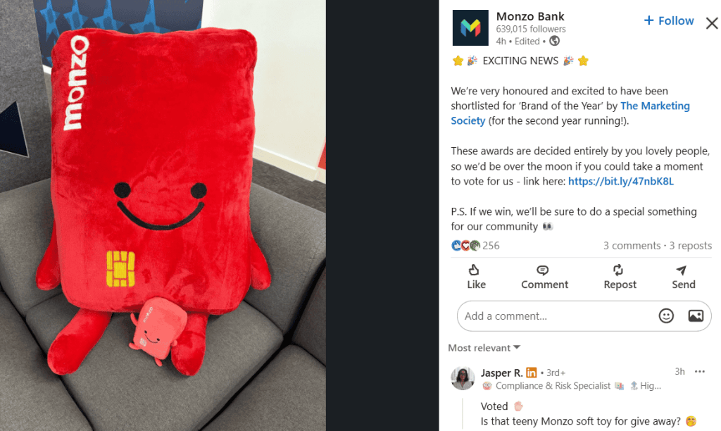 Monzo’s content strategy focuses on meeting customers where they are. They maintain the same human, conversational tone across all their social. That authenticity is exactly why Monzo was shortlisted for ‘Brand of the Year’ by The Marketing Society, for the second year running.