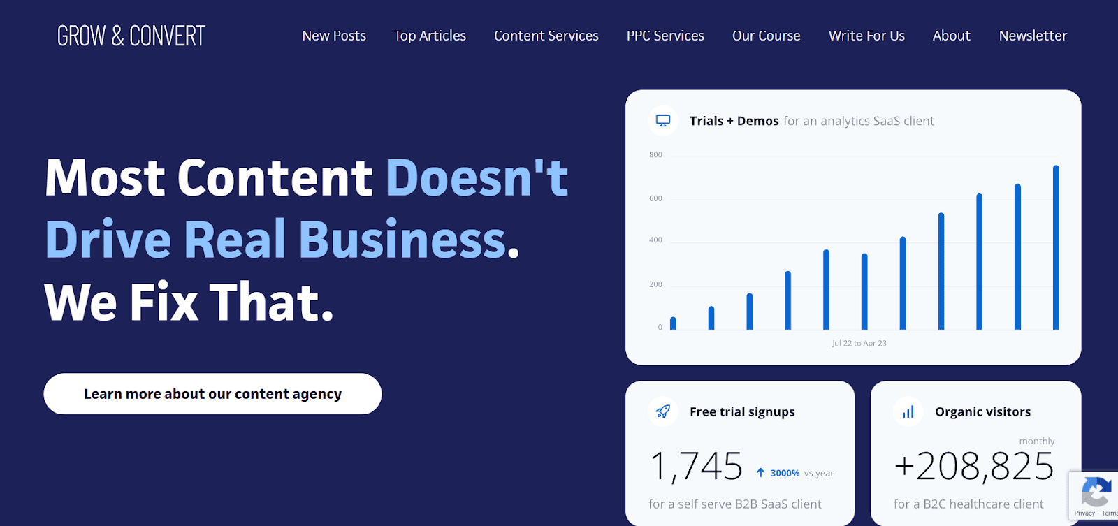 Grow and Convert is a content-driven SEO agency known for its “Pain Point SEO” methodology, targeting high-intent search queries that drive qualified leads and traffic.