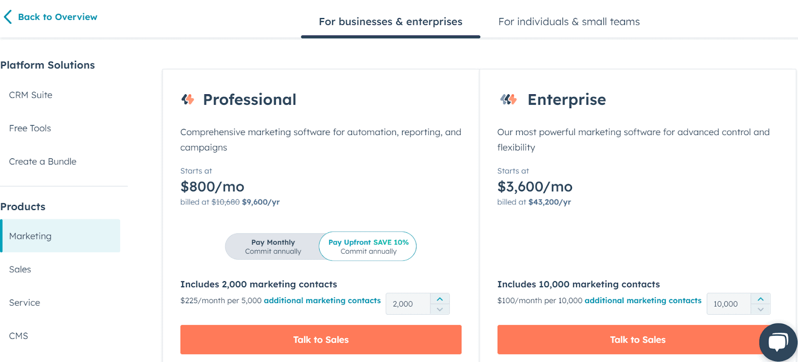 HubSpot‘s SaaS pricing page layout stands out for its comprehensive and transparent approach. Tailored for businesses and individuals, it offers clear pricing structures for Marketing Hub, catering to diverse needs.