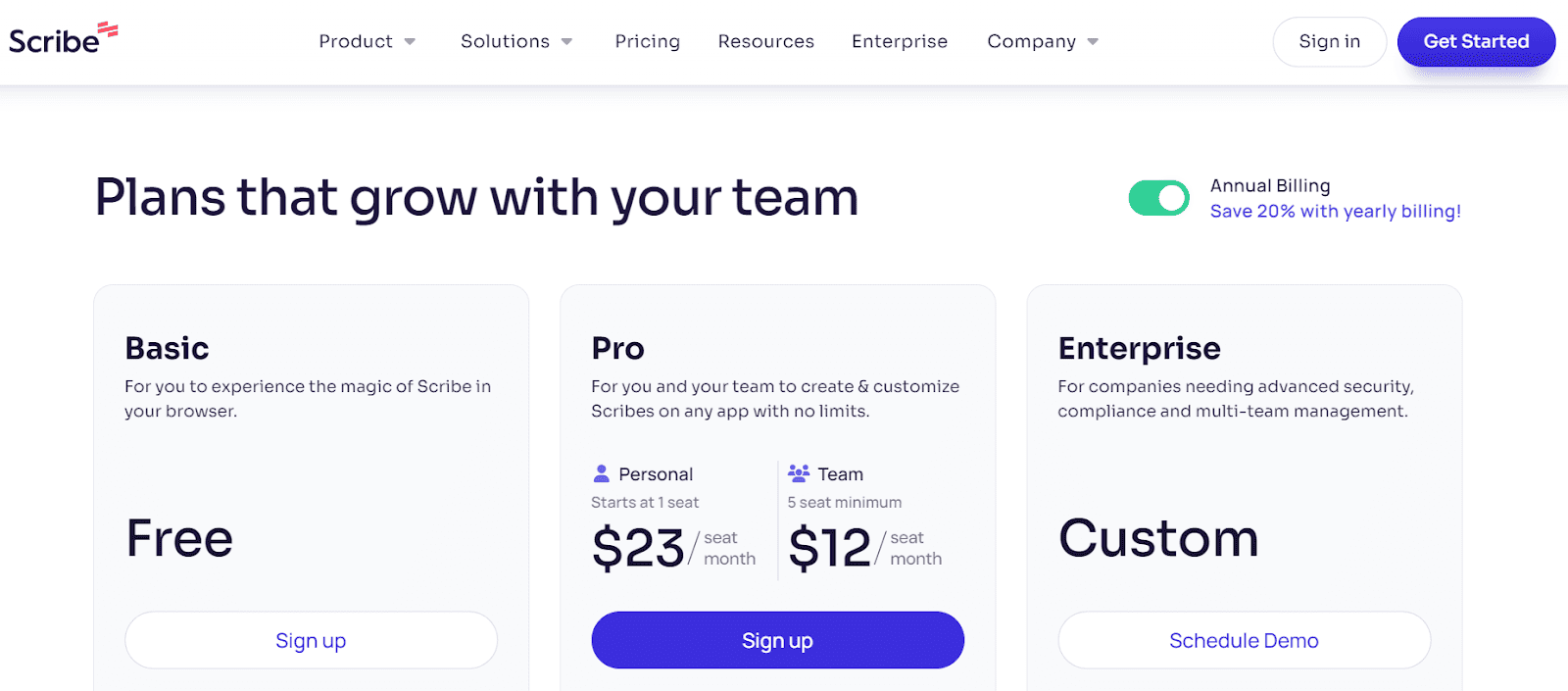 On the Scribe pricing page, the Basic plan, free of charge, introduces users to Scribe’s browser magic, and The Annual Billing option provides a 20% cost-saving benefit.