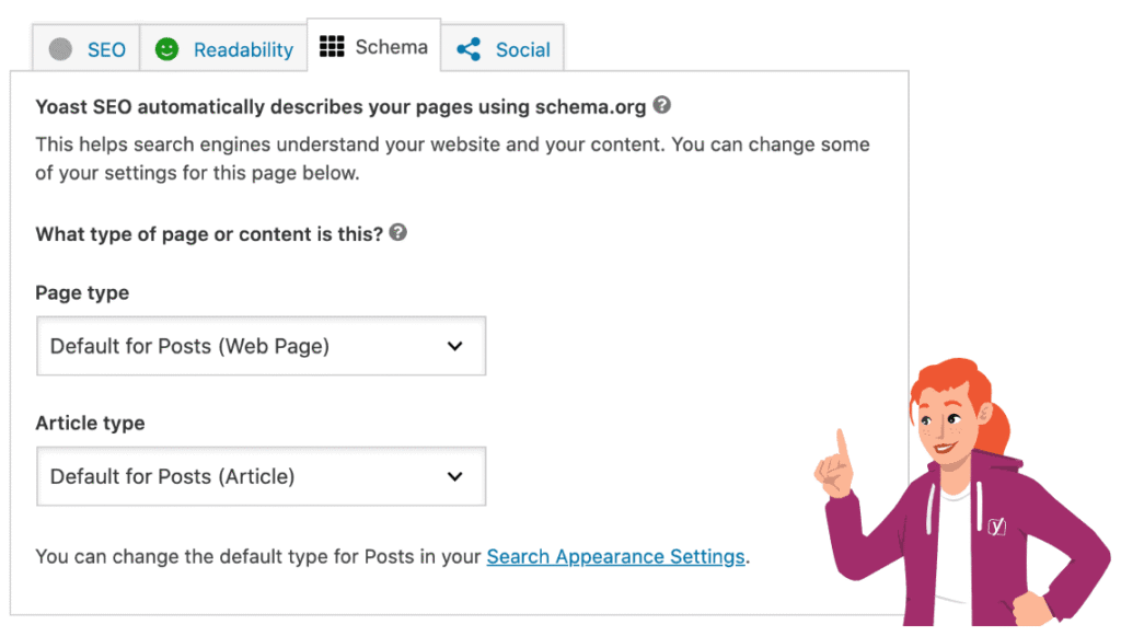 The schema describes your content for search engines. Yoast SEO generates structured data for your site, but you can change the settings yourself to add more specificity to your content.