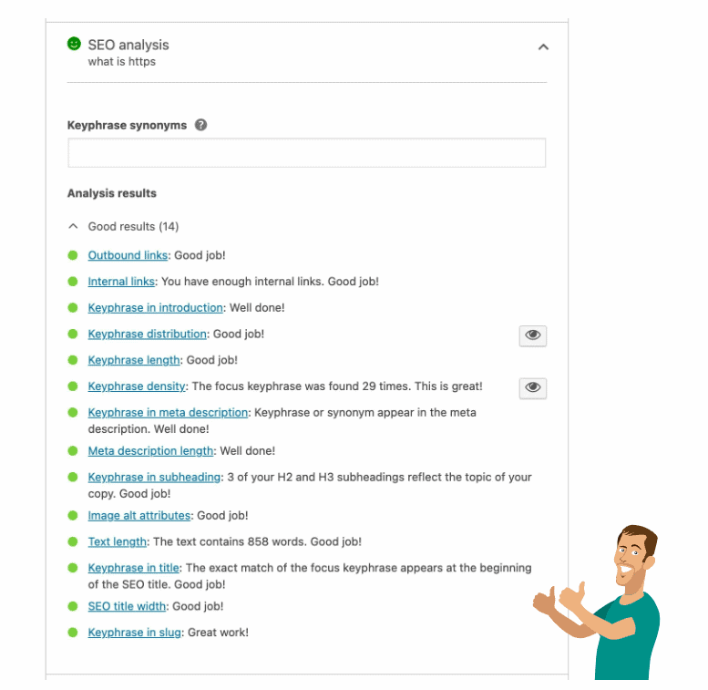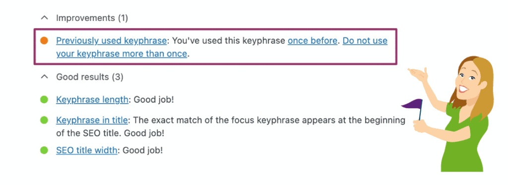 If you’re an SEO expert, you know what you need to do to make a page search engine friendly. But not everyone is an expert; the SEO analysis in Yoast SEO focuses on one keyphrase to check if you’ve used it in places where it should be. It can be your post’s title, URL, or meta description. And it warns you if you overdo it.