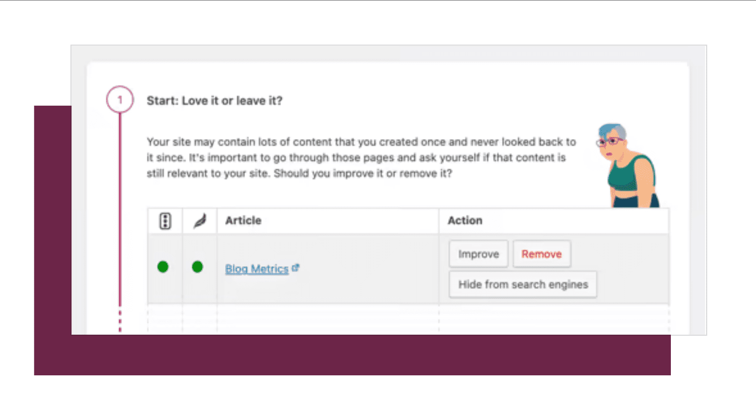 It helps you keep your site in good shape while improving rankings. To start a workout, you need to go to the Workouts section in the SEO tab of your menu. From there, you can choose an activity and start working towards better SEO health.