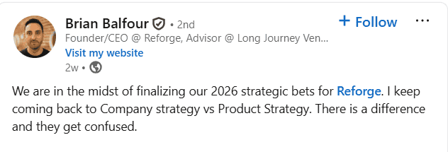 For example, Brian Balfour lays out how company‑level strategy differs from product strategy and why aligning the two is critical for future bets and growth.