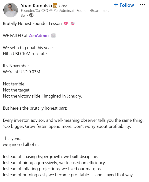 For example, Yoan Kamalski shared why ZenAdmin prioritized disciplined, sustainable growth over chasing a $10 M run-rate, signaling maturity, focus, and long-term leadership.