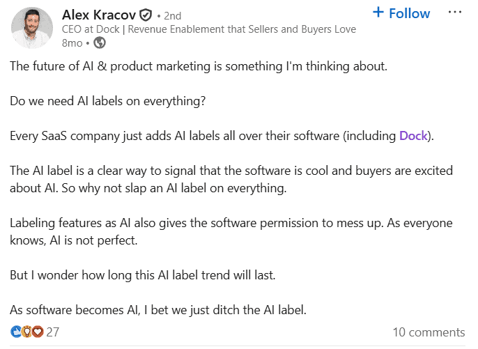 Strong founder-led content reframes how a market thinks by challenging default assumptions or popular trends. This positions founders as category thinkers. For example, Alex Kracov questions the need for “AI” labels on SaaS products, noting they may fade as AI becomes a standard expectation rather than a standout feature.