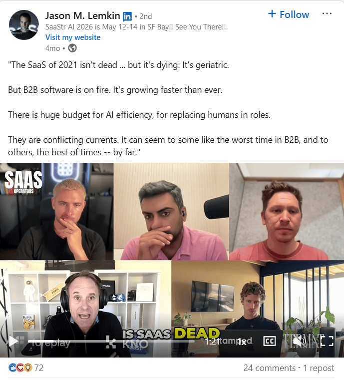 For example, Jason Lemkin challenges the “SaaS is dead” narrative by explaining how legacy SaaS models are aging, but B2B software demand continues to grow, giving founders and buyers a clearer lens to evaluate where real growth opportunities still exist.