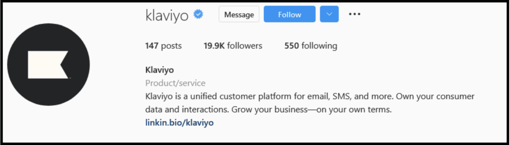 Klaviyo knows that the first thing anyone visiting their Instagram profile will notice is their bio. For this reason, they have a short bio that explains what Klaviyo is and how it helps businesses.