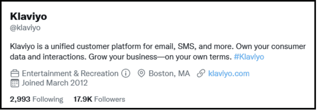 Let’s start with Twitter Bio. Klaviyo has the same bio as Instagram, which is clear and precise. The brand has promoted its Twitter hashtag to increase brand visibility. The best part is that the brand has provided a link directing the audience to its website to boost traffic. Overall, Klaviyo has used its Twitter bio the best.