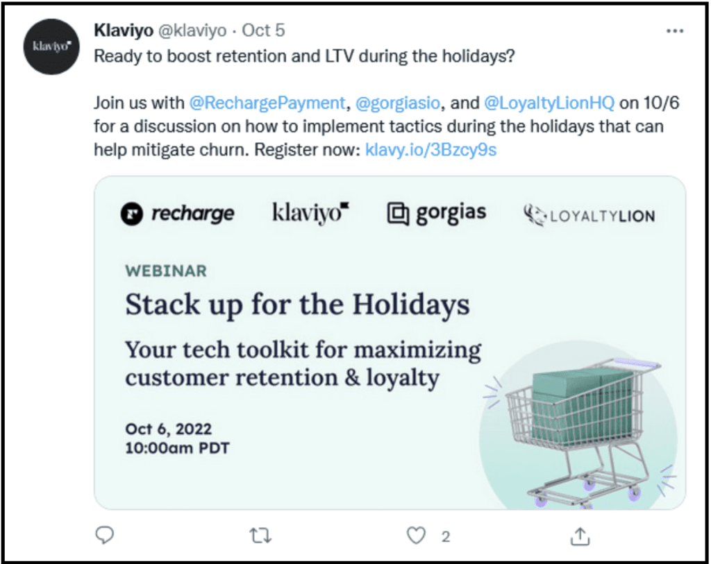 It’s simple to promote upcoming events and webinars on Twitter. How? As we can see from Klaviyo’s post, you can mention the registration link right in the caption. Customers can register for the event with just one click. You can also respond to customer questions in the comments or in direct messages.