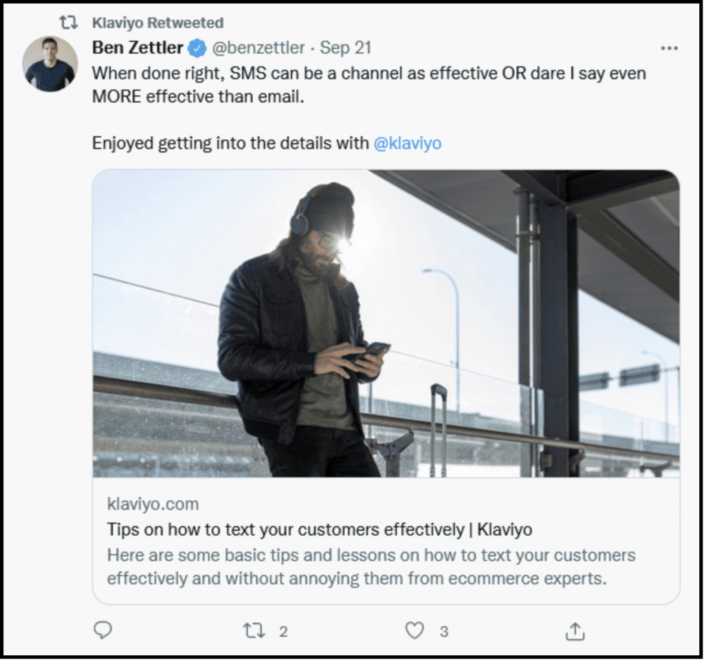 Without a strong promotion strategy, even the best blog content cannot attract readers and convert them into buyers. Because of this, Klaviyo uses Twitter to advertise its blog posts to increase its reader base, website traffic, and conversions.
