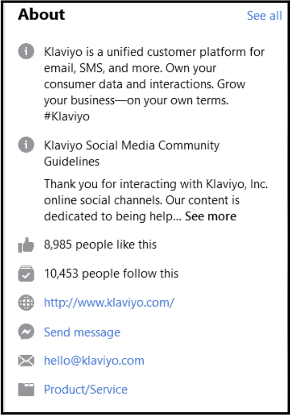 Klaviyo has a great Facebook bio. It starts with talking about the brand and how it helps businesses grow. It then has a link in the bio to redirect traffic to its website. The brand has made it easy for customers to contact by mentioning its email and Facebook messenger.