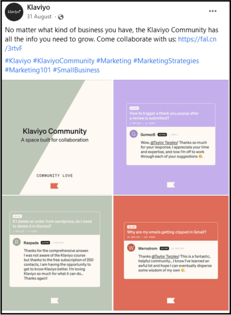 Building social media community is very important as it boosts engagement. Klaviyo has focused on building a social media community on platforms like Facebook and Reddit. Users become more close to your brand with every active engagement. They make your brand more visible on the platform. More potential customers see your profiles as a result of this.
