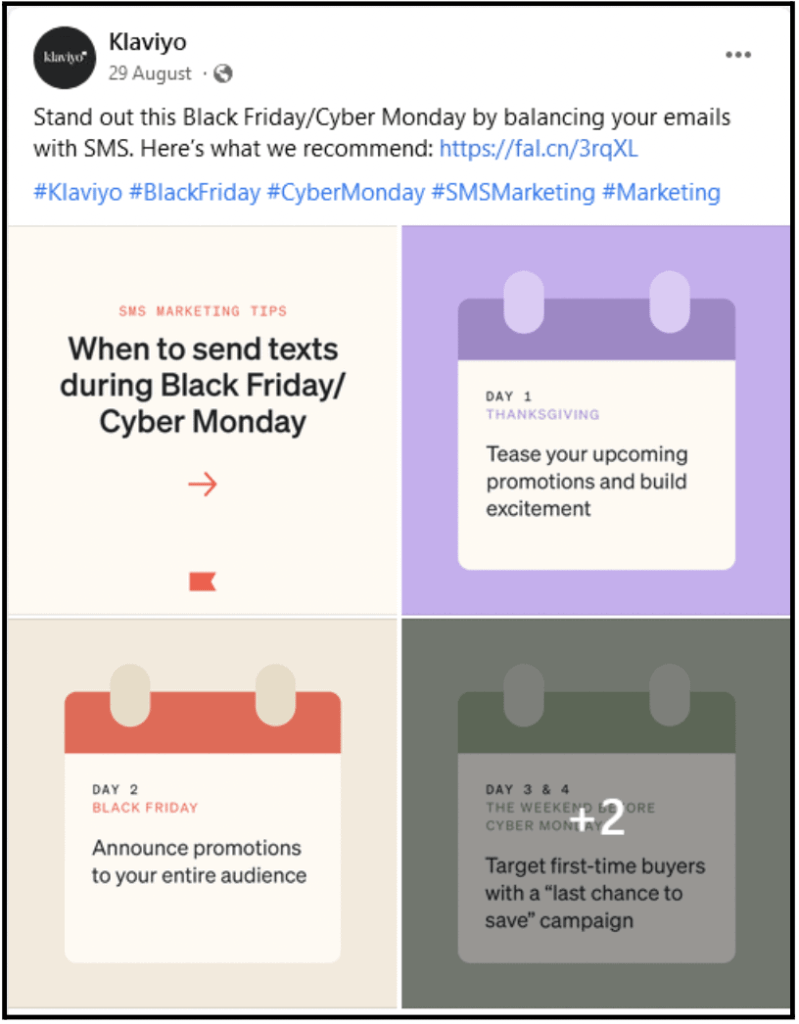 Look at this post by Klaviyo, which explains how B2B firms may utilize email and SMS marketing during BFCM sales. It’s a great approach to inform and keep your audience engaged.