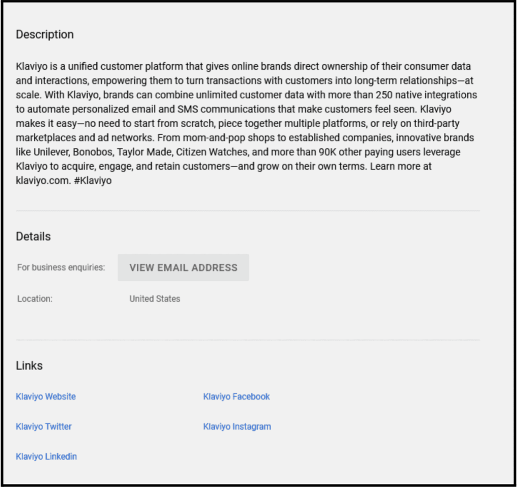 Let’s first talk about Klaviyo’s YouTube About section. We can see a clear brand description first, followed by an email address for business inquiries and links to the brand’s website and other social media accounts. The section has all the important details that a B2B brand needs.