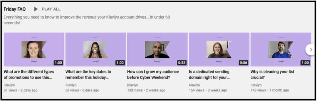 Klaviyo is one of few B2B brands which have explored YouTube playlists. If you don’t know YouTube playlists, make it easy for viewers to find the videos they want to watch – with a few simple clicks, videos are saved and sorted.