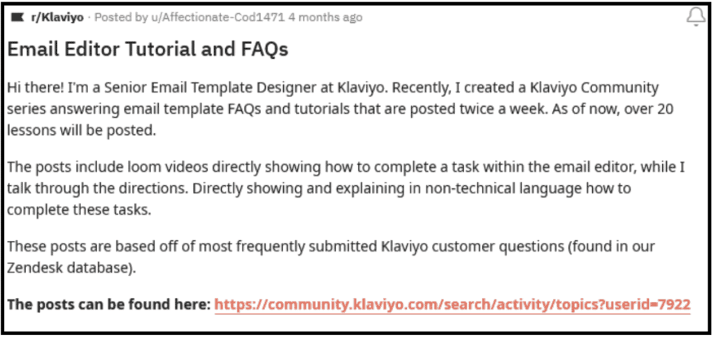 We like how Klaviyo took over Twitter to promote its email template FAQs and tutorial. Moreover, they create a single link for all the posts so the audience can access content easily— a great strategy to promote your content on Reddit.