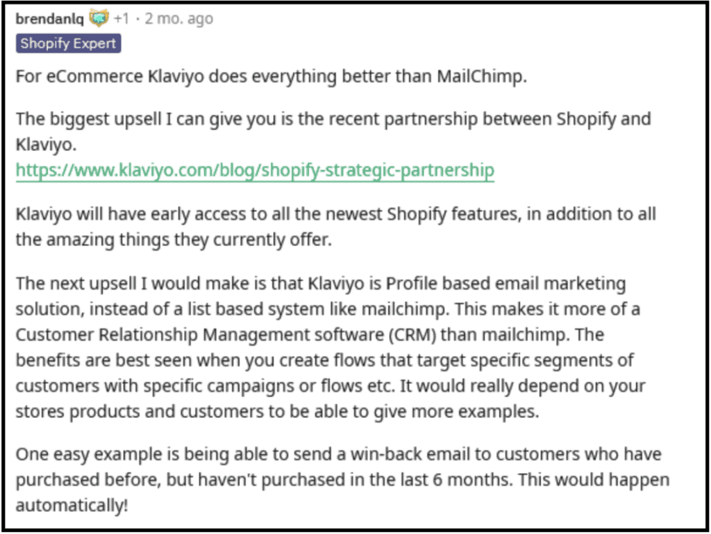 For instance, look at this Reddit conversation where a person mentions his experience with MailChimp and Klaviyo. This makes it clear how Klaviyo is outperforming its competing platform MailChimp.