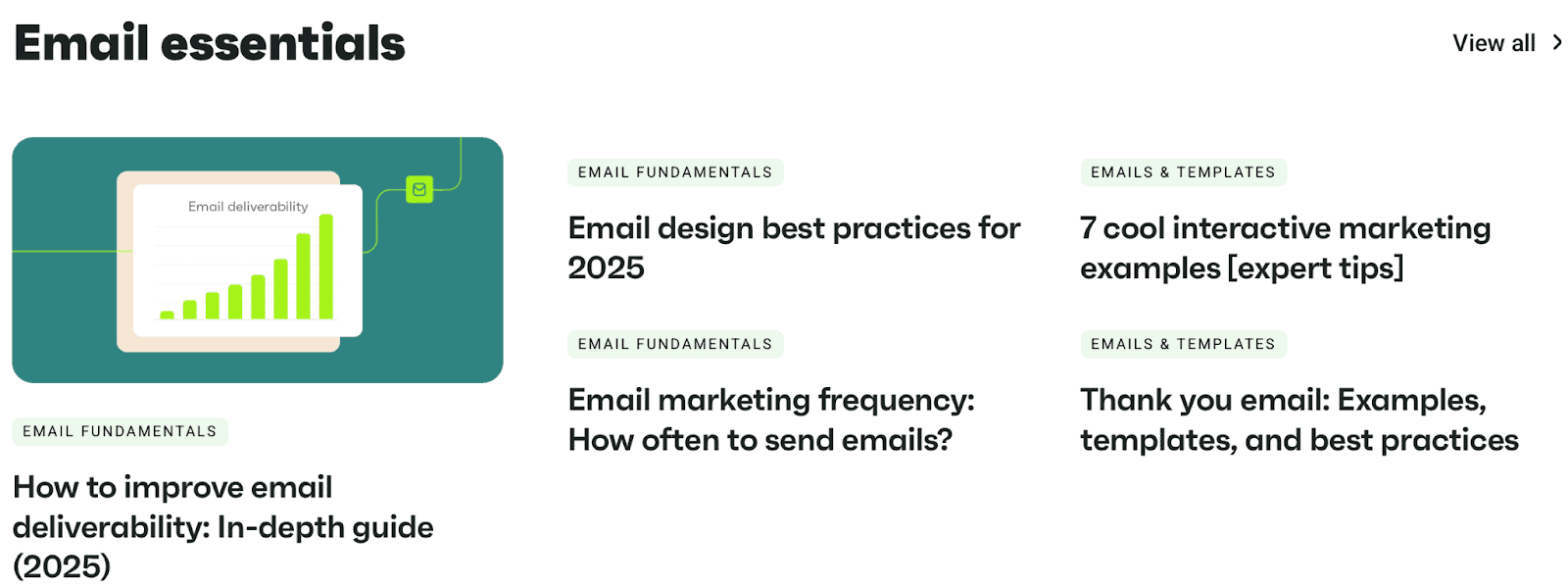 The content includes topics like email marketing, email essentials, and tool reviews.