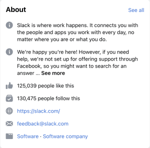 Facebook provides an option for an “About” section in place of the bio and highlights. Slack has highlighted its mission statement, here again, making it clear how the brand is dedicated to solving a customer pain point.