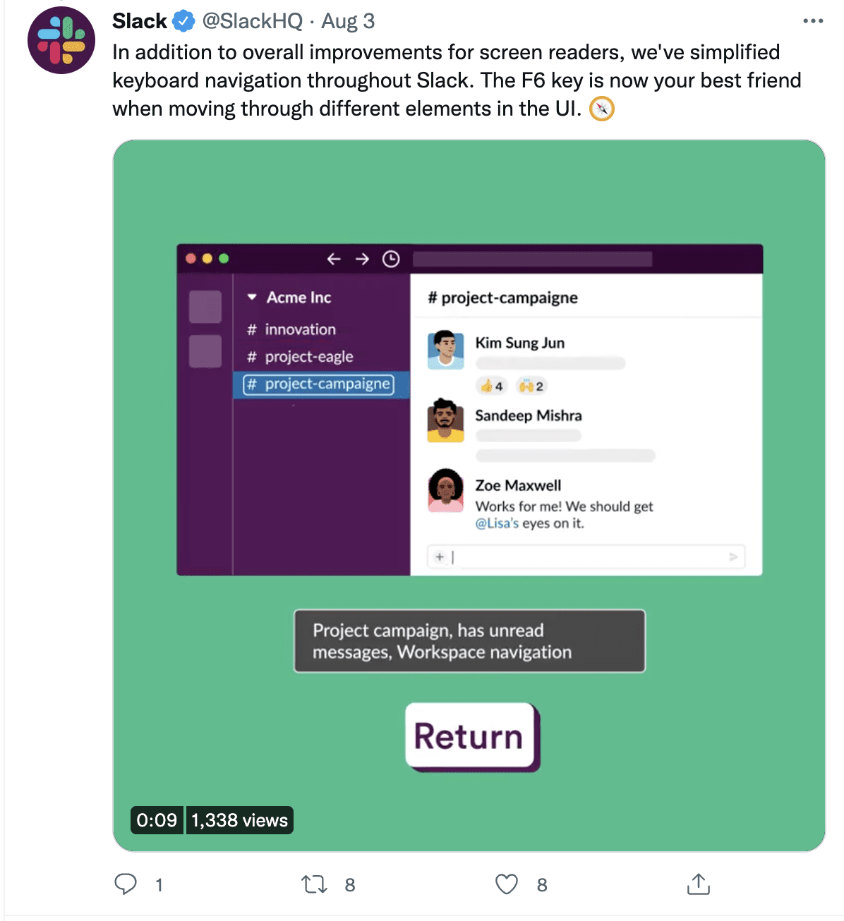 Given that audiences like seeing short videos, Slack uses it to inform customers about new and updated features.